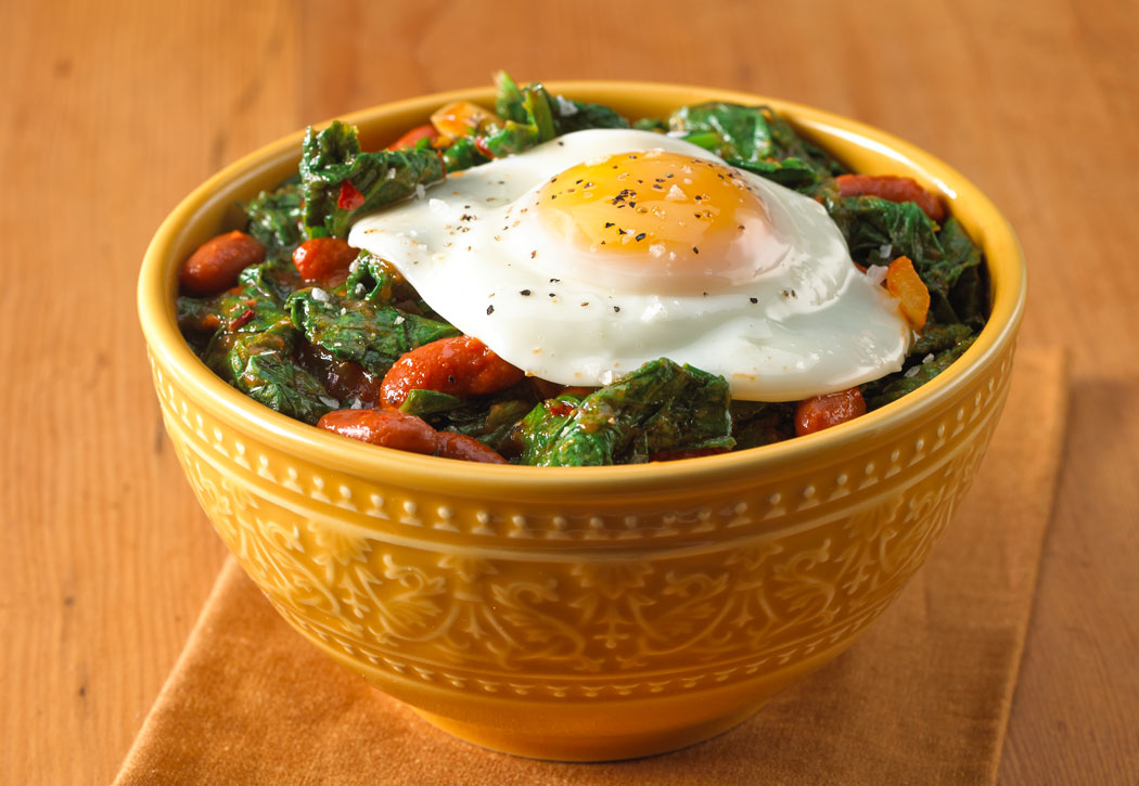 Optional with eggs, 1 for each serving: In a medium skillet, heat the butter over medium until melted and starting to brown. Crack the eggs into the pan and cook until the whites are just set and the yolks are runny, about 3 minutes. Season with salt and pepper. Divide curried greens and beans into individual bowls. Slide the eggs on top of each portion. Serve hot.